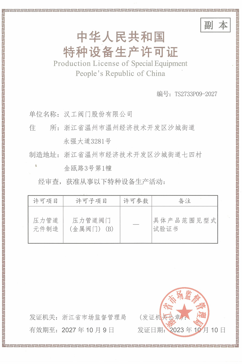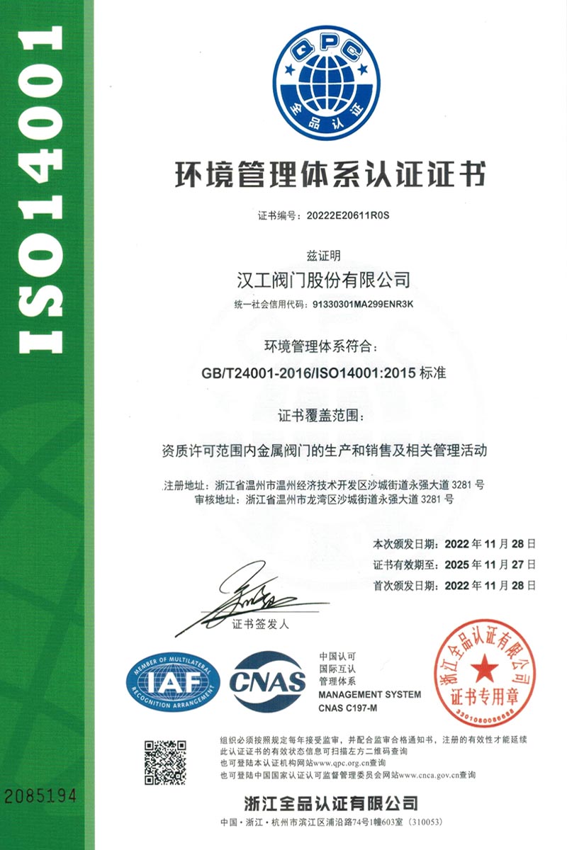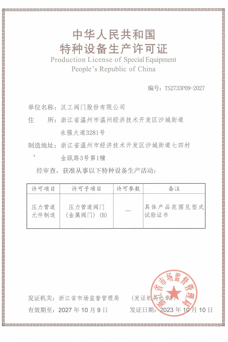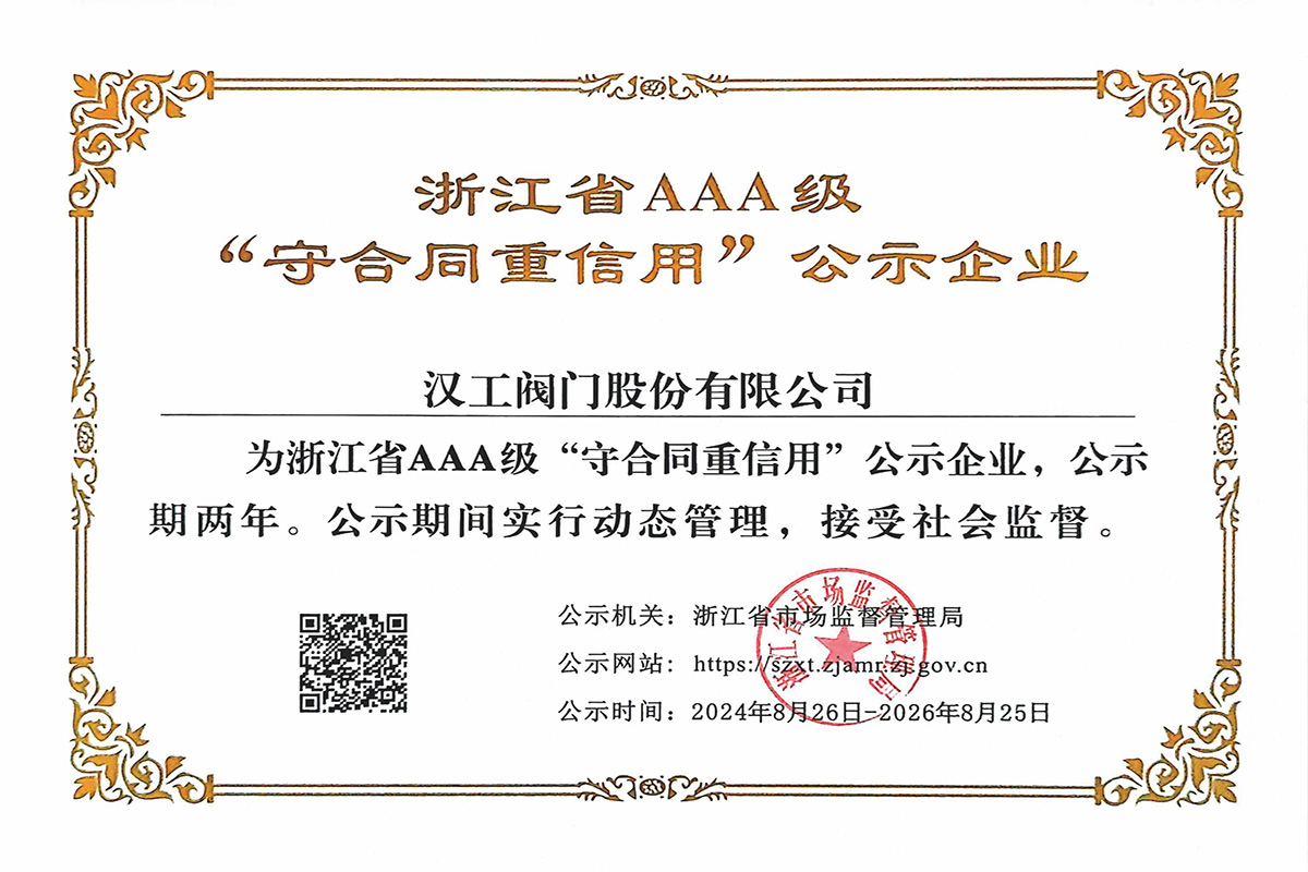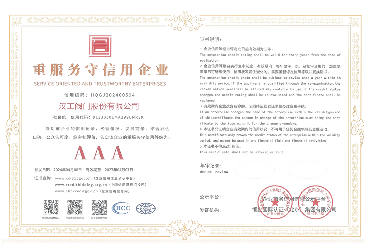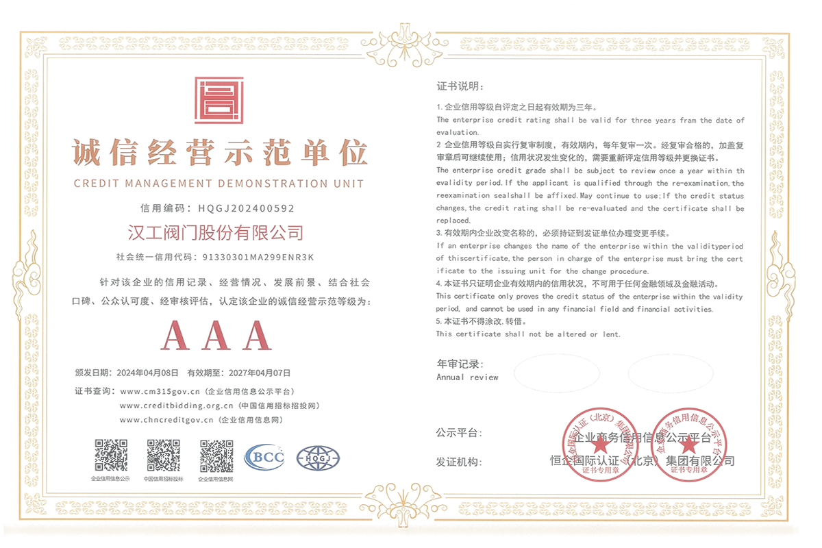 公司先后通過了ISO9001:2008國際質(zhì)量管理體系認證,ISO4001:2004環(huán)境管理體系認證,GB/T28001-2001職業(yè)健康安全管理體系認證,中華人民共和國特種設備制造許可認證(TS),中國石油和石油化工設備工業(yè)協(xié)會團體會員單位,中國化工集團公司合格供應商成員單位,中國華電集團公司集團級供應商成員單位,中國華能集團公司供應商,中國城市燃氣協(xié)會團體會員,中國建筑金屬結(jié)構(gòu)協(xié)會會員單位,中國著名品牌等這一系列的質(zhì)保體系是漢工閥門在設計、開發(fā)、制造、銷售、服務于一體的后盾力量,確保了漢工閥門的質(zhì)量與品牌。